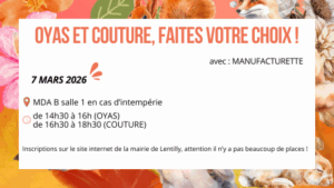 🔹 Atelier Couture anti-gaspi – 16h30 à 18h30 (8 places)* Apprenez à revaloriser des tissus et à réduire les déchets textiles en créant un objet du quotidien tout en découvrant les bases de la couture. *Places supplémentaires possibles avec machine à coudre personnelle.