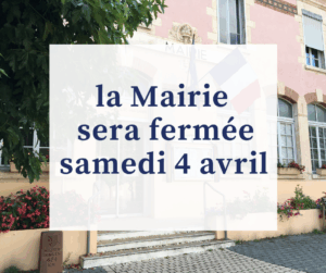 Fermeture mairie le 4 avril 2026 Dernière mise à jour le 30 mars 2026 AccueilActualitésFermeture mairie le 4 avril 2026 La Mairie sera fermée le samedi 4 avril 2026 Partager cet article sur : Nos dernières actualités CCPA – Semaines de l’environnement En savoir + Travaux – Inspections nocturnes du système d’assainissement du Buvet En savoir + Vacances Seniors 2026 En savoir +