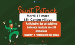 Rendez-vous mardi 17 mars à partir de 18h au centre village pour célébrer ensemble cette soirée festive aux couleurs de l’Irlande